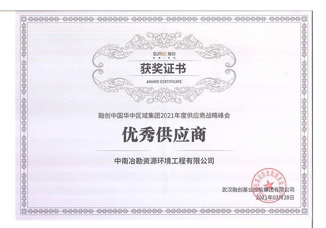 2021年度武汉融创城优秀供应商奖荣誉证书