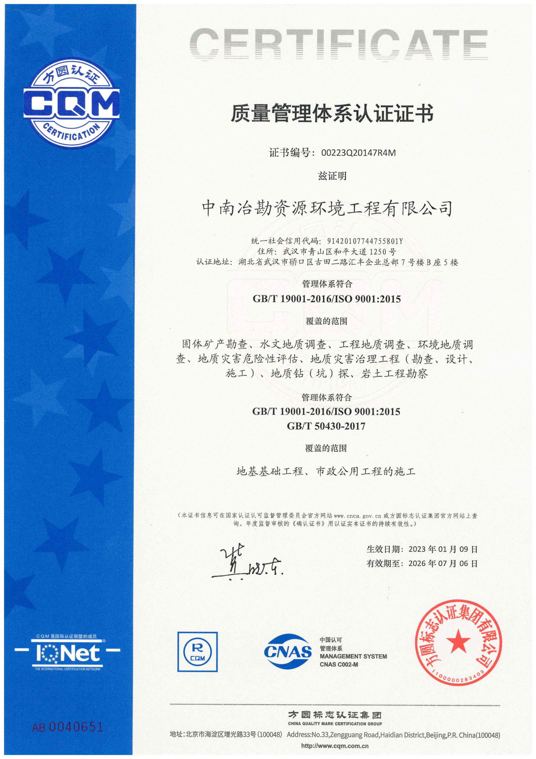 质量管理体系认证证书