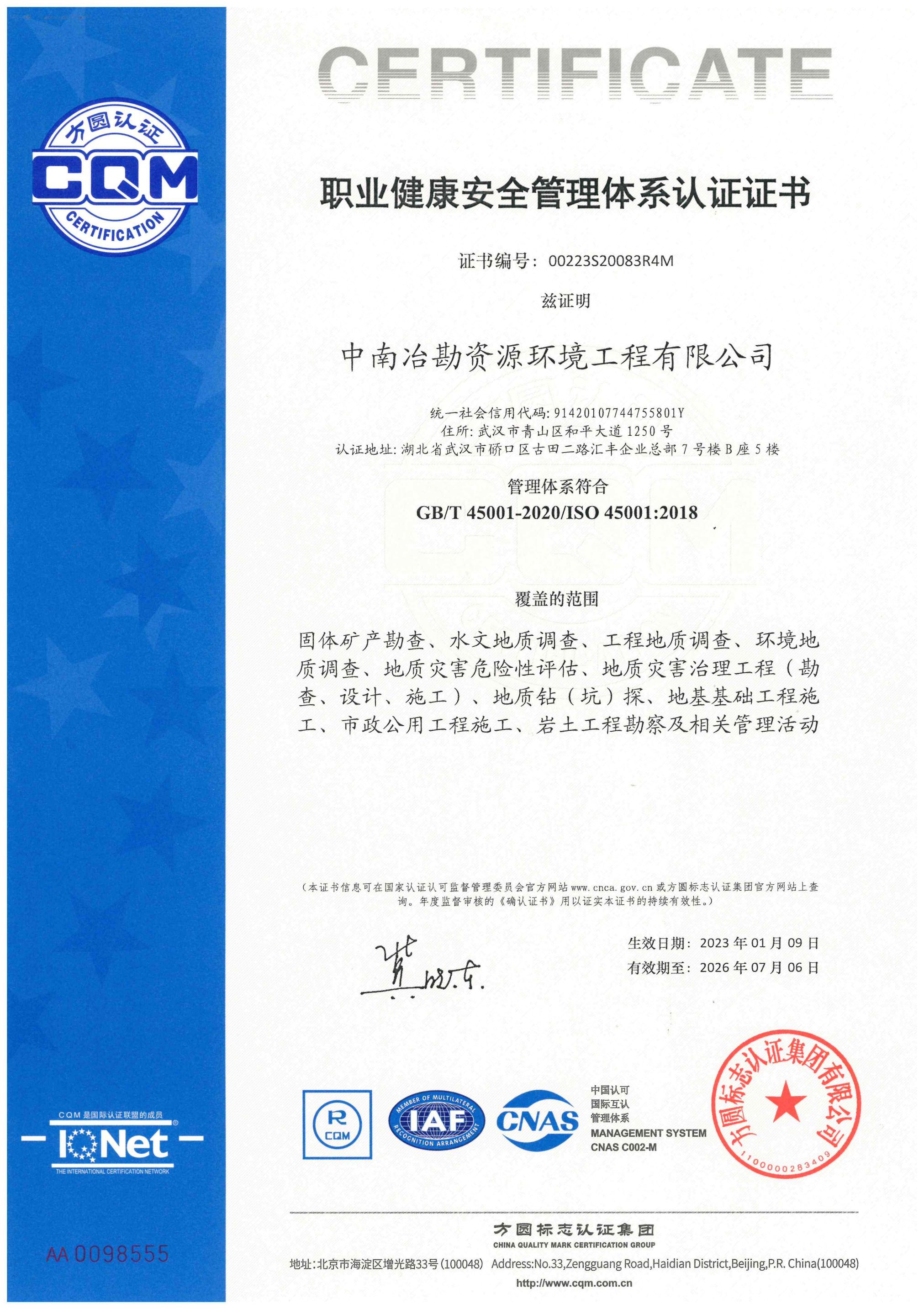 职业健康安全管理体系认证证书