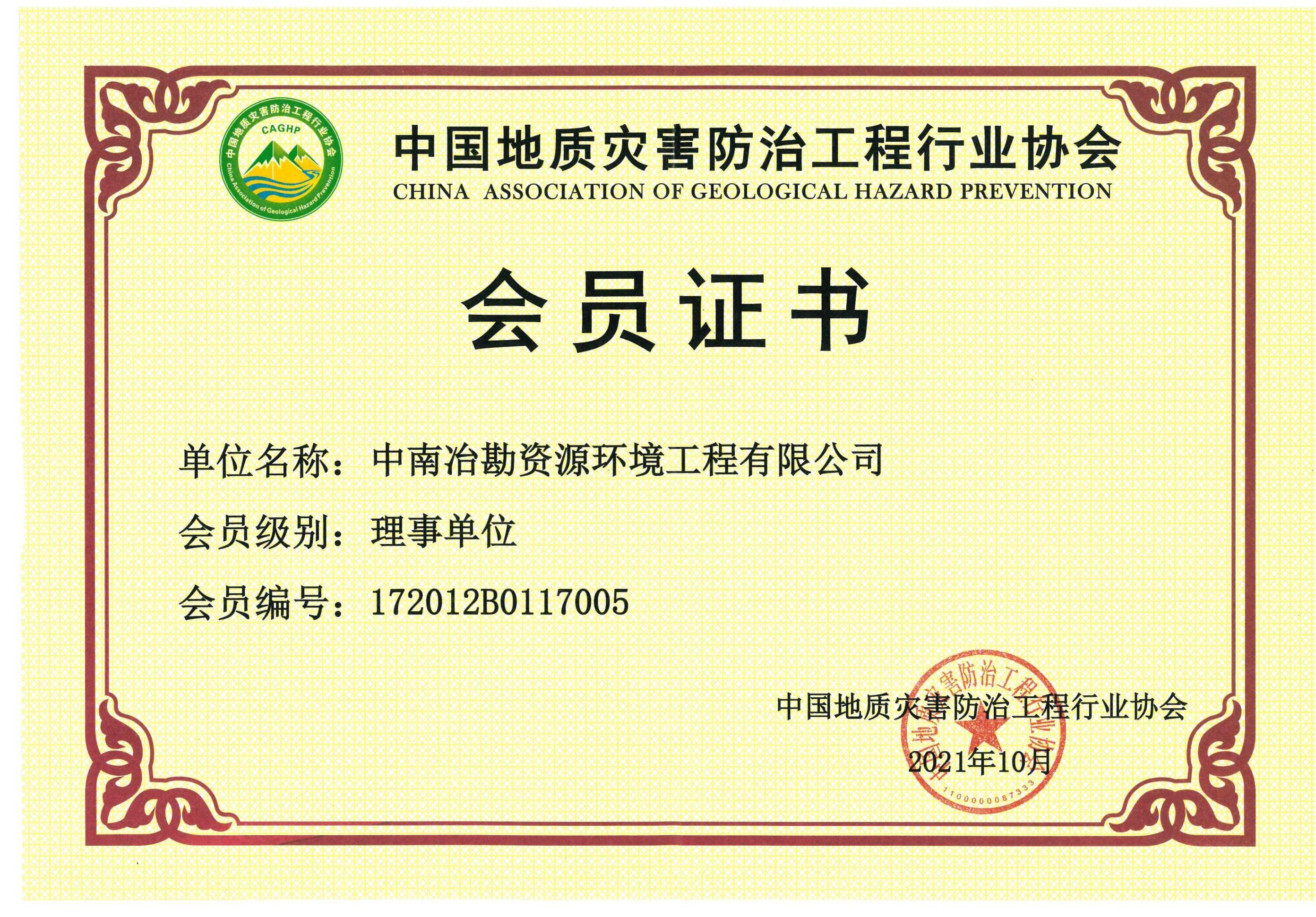 中国冶金建设协会会员证书