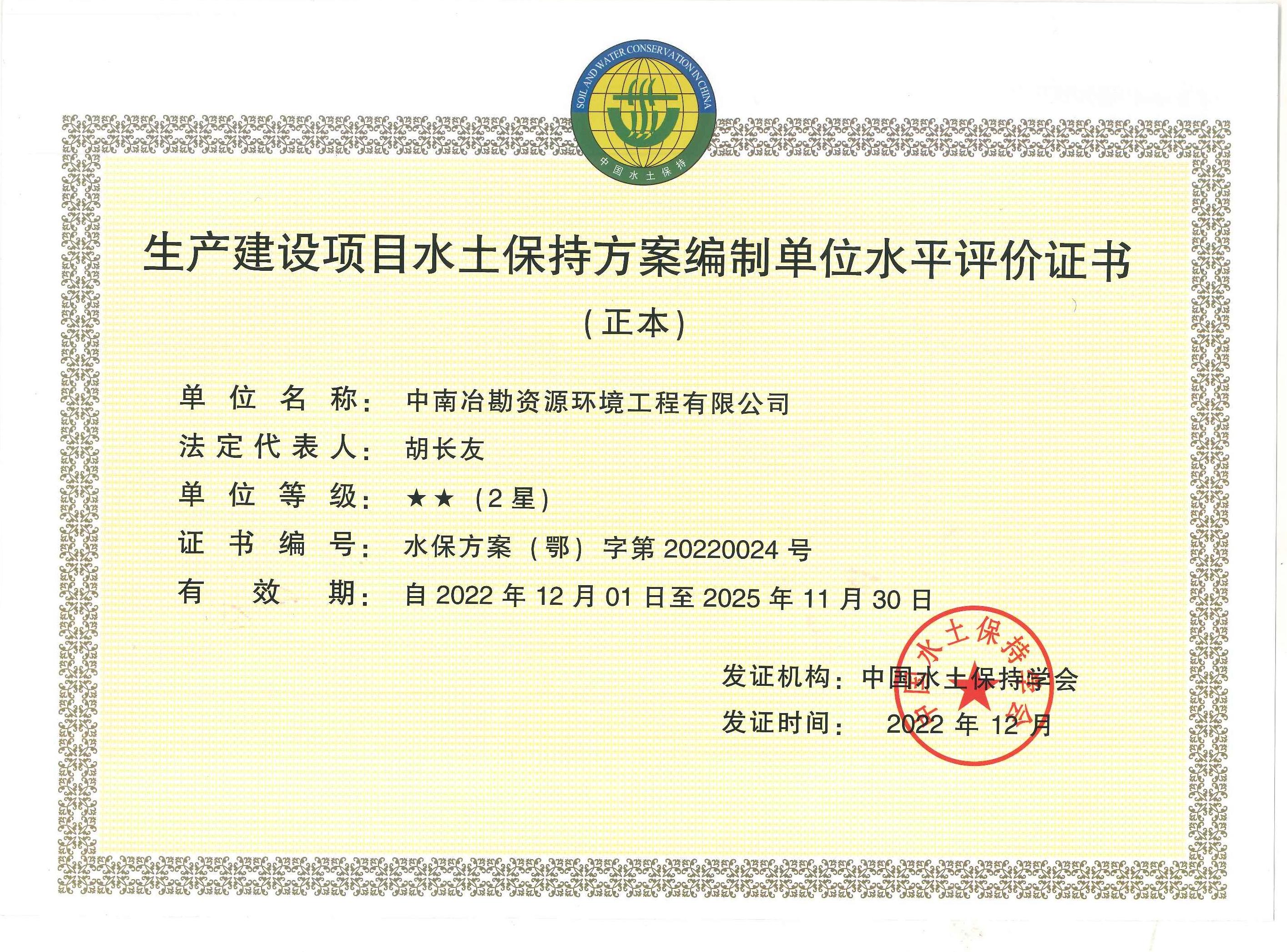 生产建设项目水土保持方案编制单位水平评价证书